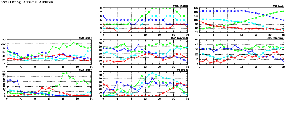 | Air Quality Data Time Series in Kwai Chung (2018/06/13) | ( Line colors: Day -3 Day -2 Day -1 Current day ) | 2D Map Current AQHI |