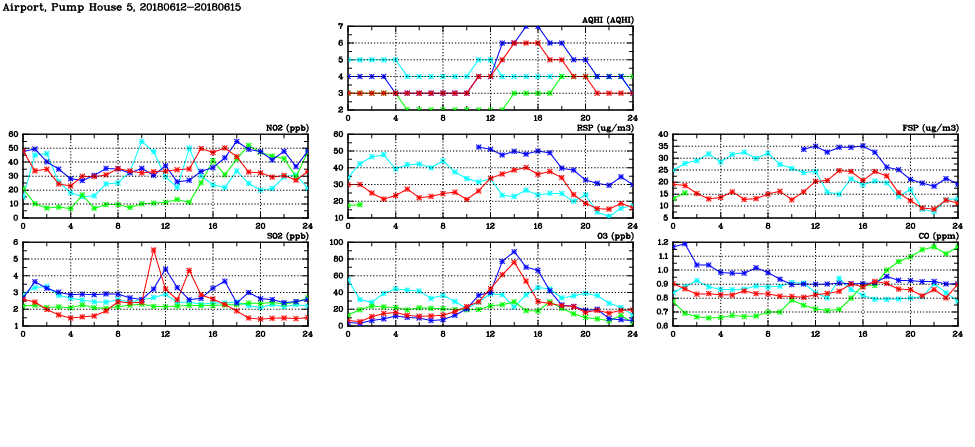 | Air Quality Data Time Series in Airport, Pump House 5 (2018/06/15) | ( Line colors: Day -3 Day -2 Day -1 Current day ) | 2D Map Current AQHI |