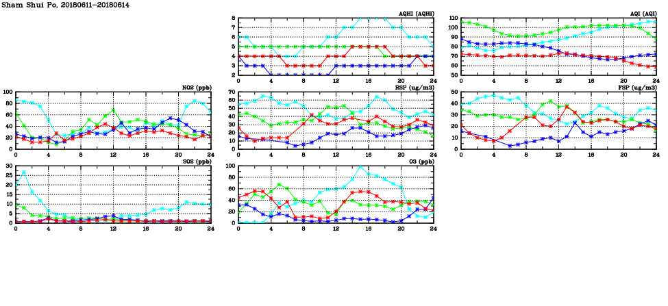 | Air Quality Data Time Series in Sham Shui Po (2018/06/14) | ( Line colors: Day -3 Day -2 Day -1 Current day ) | 2D Map Current AQHI |
