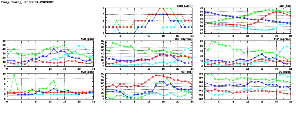 | Air Quality Data Time Series in Tung Chung (2018/06/16) | ( Line colors: Day -3 Day -2 Day -1 Current day ) | 2D Map Current AQHI |
