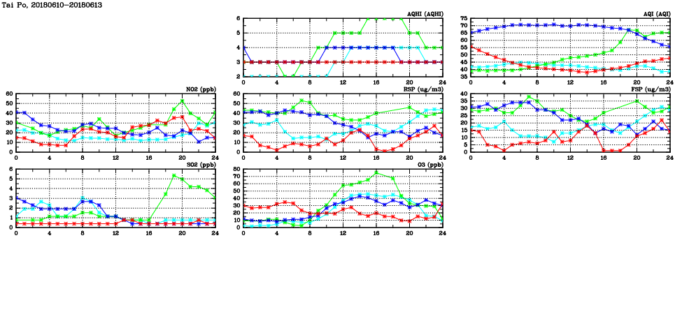 | Air Quality Data Time Series in Tai Po (2018/06/13) | ( Line colors: Day -3 Day -2 Day -1 Current day ) | 2D Map Current AQHI |