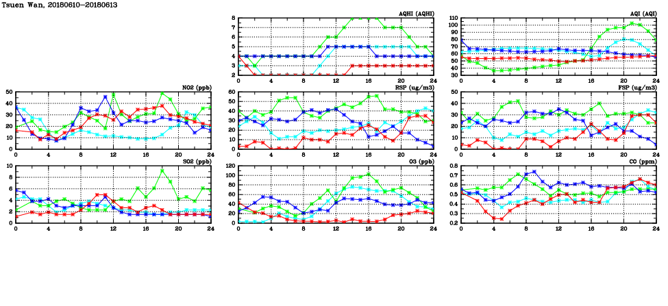 | Air Quality Data Time Series in Tsuen Wan (2018/06/13) | ( Line colors: Day -3 Day -2 Day -1 Current day ) | 2D Map Current AQHI |