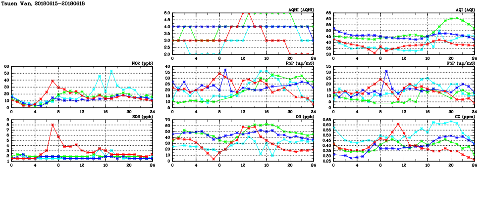 | Air Quality Data Time Series in Tsuen Wan (2018/06/18) | ( Line colors: Day -3 Day -2 Day -1 Current day ) | 2D Map Current AQHI |