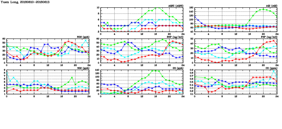 | Air Quality Data Time Series in Yuen Long (2018/06/13) | ( Line colors: Day -3 Day -2 Day -1 Current day ) | 2D Map Current AQHI |