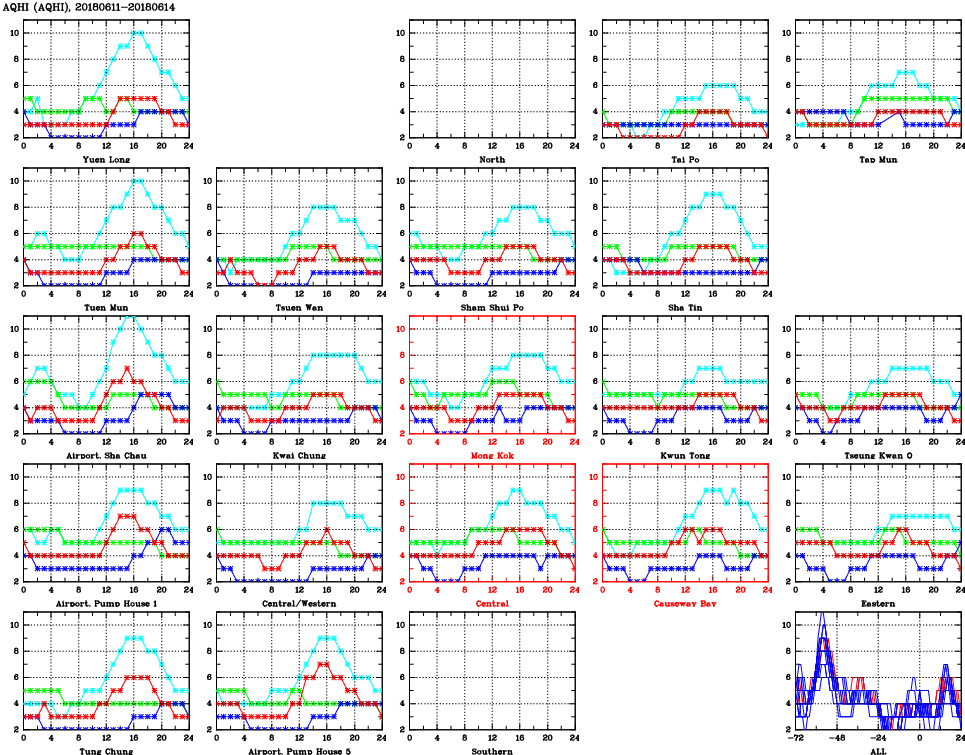 | Air Quality Data Time Series for AQHI (2018/06/14) | ( Line colors: Day -3 Day -2 Day -1 Current day ) | 2D Map Current AQHI |