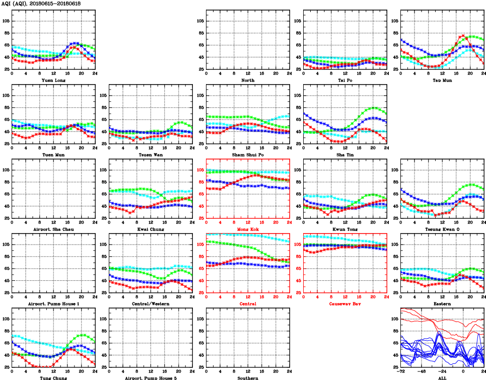 | Air Quality Data Time Series for AQI (2018/06/18) | ( Line colors: Day -3 Day -2 Day -1 Current day ) | 2D Map Current AQHI |