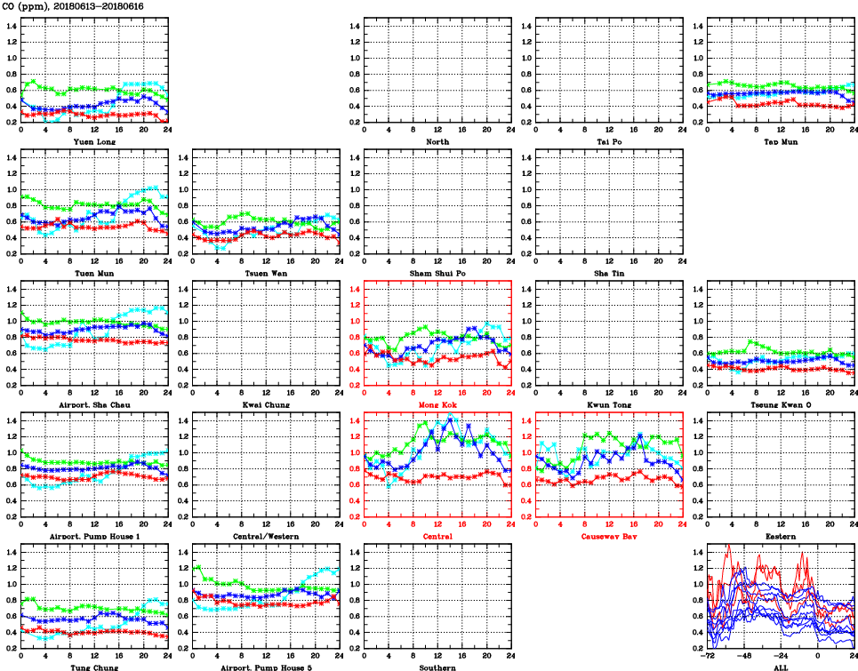 | Air Quality Data Time Series for CO (2018/06/16) | ( Line colors: Day -3 Day -2 Day -1 Current day ) | 2D Map Current AQHI |