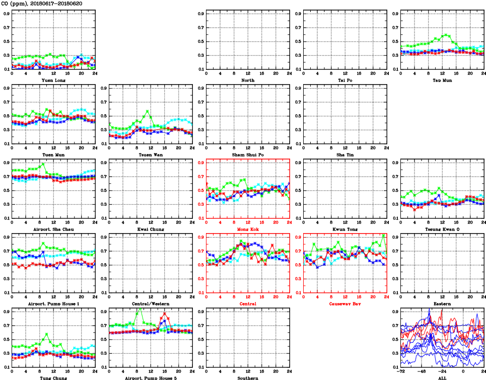 | Air Quality Data Time Series for CO (2018/06/20) | ( Line colors: Day -3 Day -2 Day -1 Current day ) | 2D Map Current AQHI |