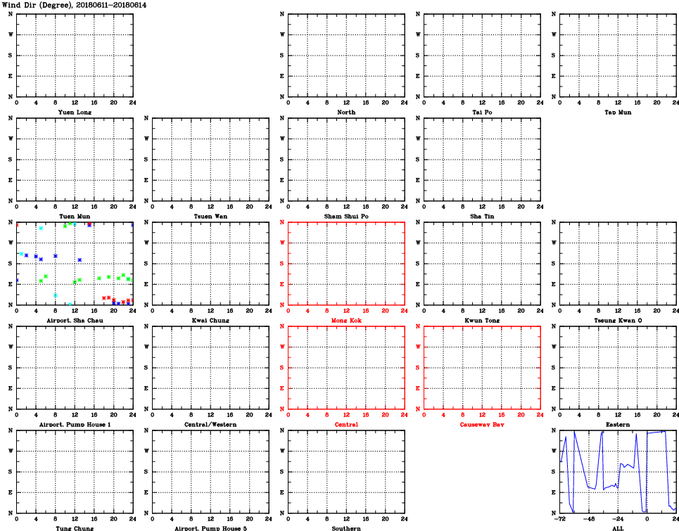 | Air Quality Data Time Series for WD (2018/06/14) | ( Line colors: Day -3 Day -2 Day -1 Current day ) | 2D Map Current AQHI |