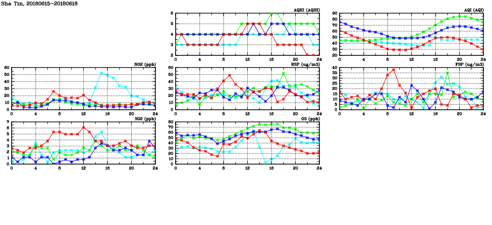 | Air Quality Data Time Series in Sha Tin (2018/06/18) | ( Line colors: Day -3 Day -2 Day -1 Current day ) | 2D Map Current AQHI |