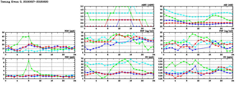 | Air Quality Data Time Series in Tseung Kwan O (2018/06/20) | ( Line colors: Day -3 Day -2 Day -1 Current day ) | 2D Map Current AQHI |