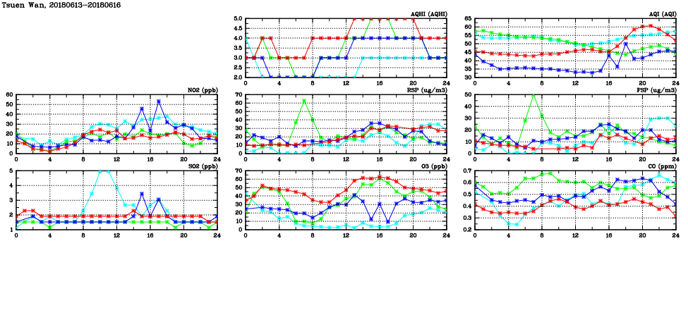 | Air Quality Data Time Series in Tsuen Wan (2018/06/16) | ( Line colors: Day -3 Day -2 Day -1 Current day ) | 2D Map Current AQHI |