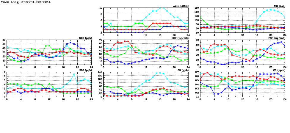 | Air Quality Data Time Series in Yuen Long (2018/06/14) | ( Line colors: Day -3 Day -2 Day -1 Current day ) | 2D Map Current AQHI |