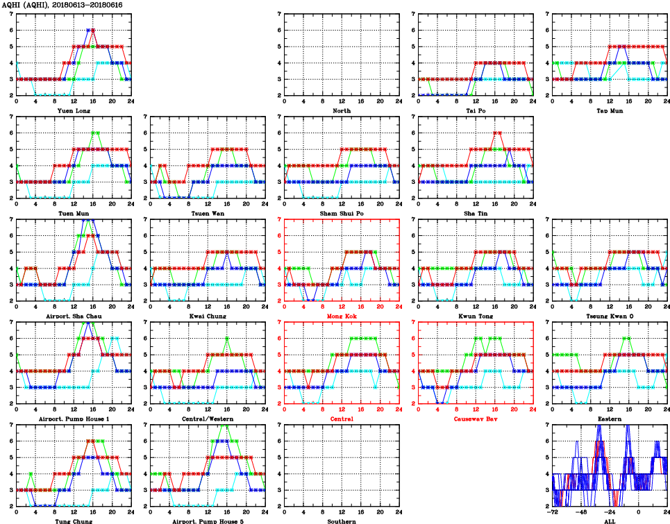 | Air Quality Data Time Series for AQHI (2018/06/16) | ( Line colors: Day -3 Day -2 Day -1 Current day ) | 2D Map Current AQHI |
