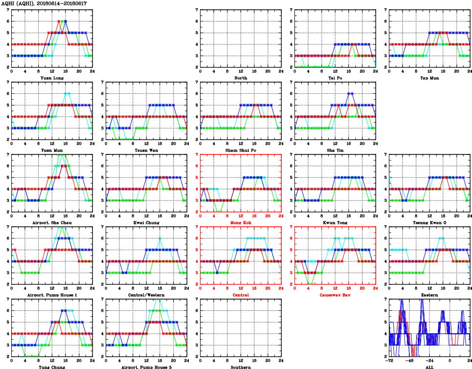 | Air Quality Data Time Series for AQHI (2018/06/17) | ( Line colors: Day -3 Day -2 Day -1 Current day ) | 2D Map Current AQHI |