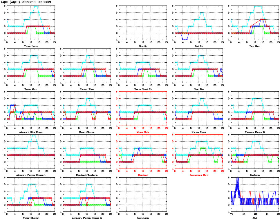 | Air Quality Data Time Series for AQHI (2018/06/21) | ( Line colors: Day -3 Day -2 Day -1 Current day ) | 2D Map Current AQHI |