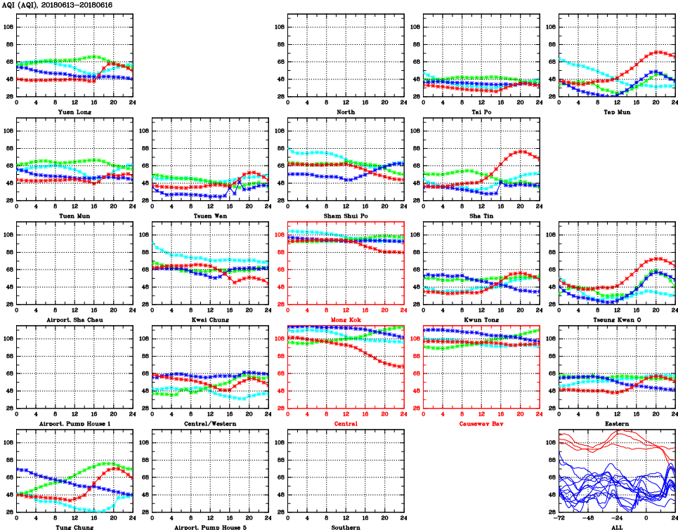 | Air Quality Data Time Series for AQI (2018/06/16) | ( Line colors: Day -3 Day -2 Day -1 Current day ) | 2D Map Current AQHI |
