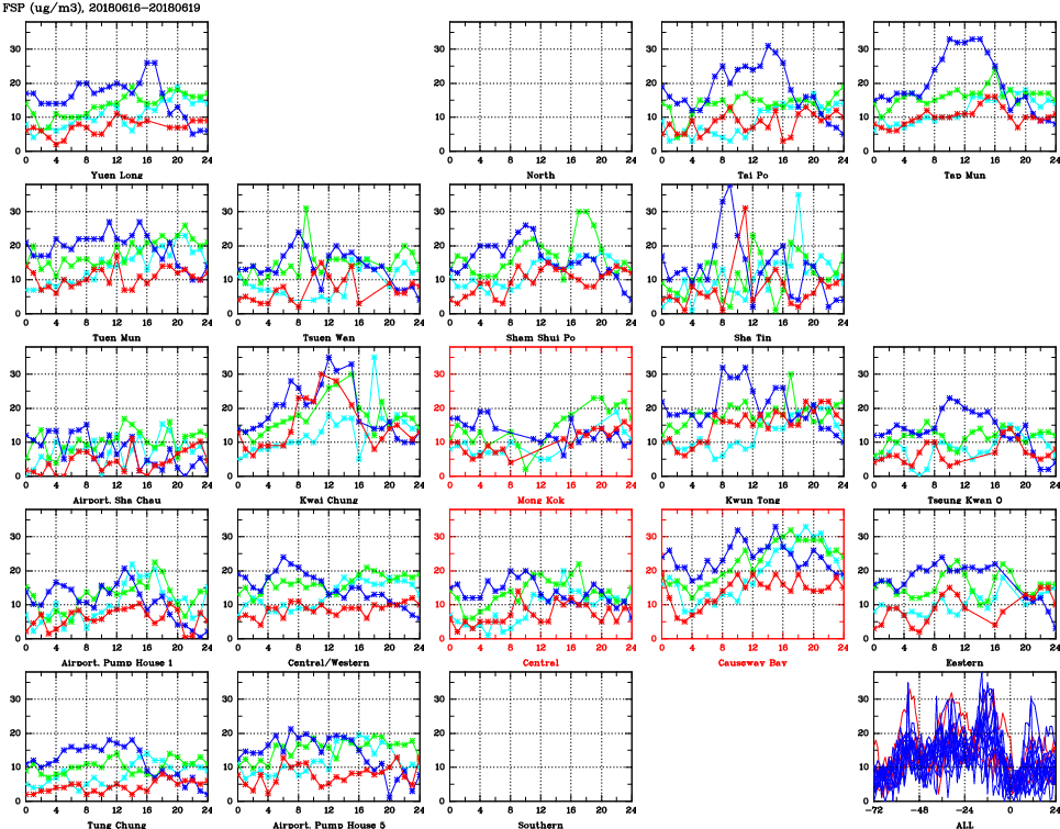 | Air Quality Data Time Series for FSP (2018/06/19) | ( Line colors: Day -3 Day -2 Day -1 Current day ) | 2D Map Current AQHI |