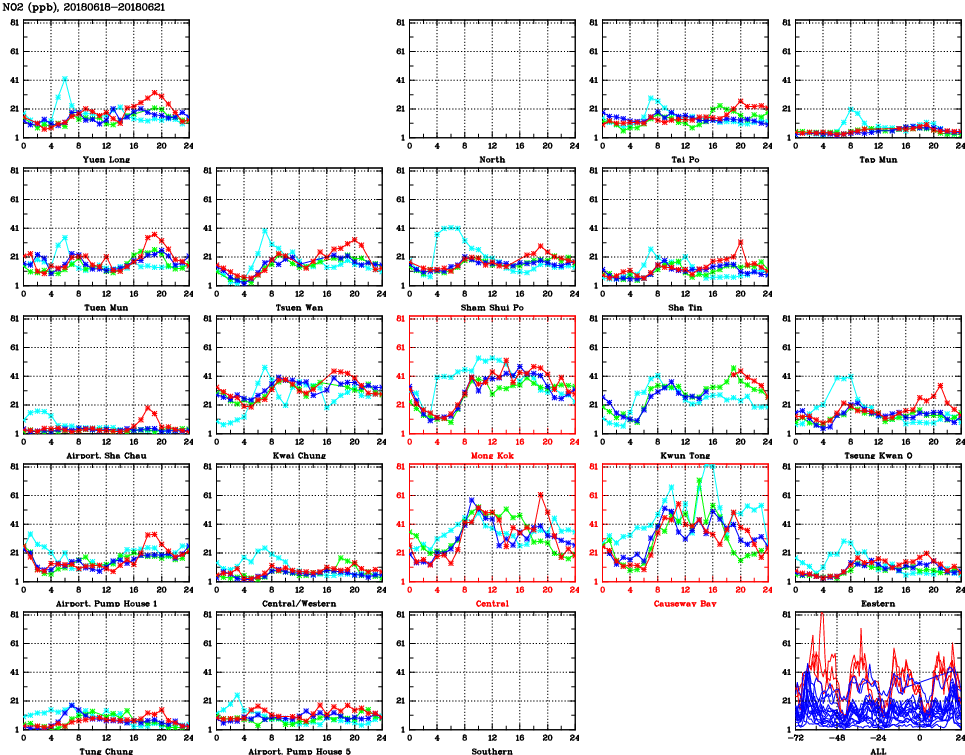 | Air Quality Data Time Series for NO2 (2018/06/21) | ( Line colors: Day -3 Day -2 Day -1 Current day ) | 2D Map Current AQHI |