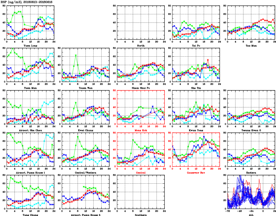 | Air Quality Data Time Series for RSP (2018/06/16) | ( Line colors: Day -3 Day -2 Day -1 Current day ) | 2D Map Current AQHI |