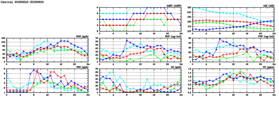 | Air Quality Data Time Series in Central (2018/06/15) | ( Line colors: Day -3 Day -2 Day -1 Current day ) | 2D Map Current AQHI |