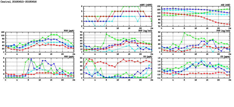| Air Quality Data Time Series in Central (2018/06/16) | ( Line colors: Day -3 Day -2 Day -1 Current day ) | 2D Map Current AQHI |