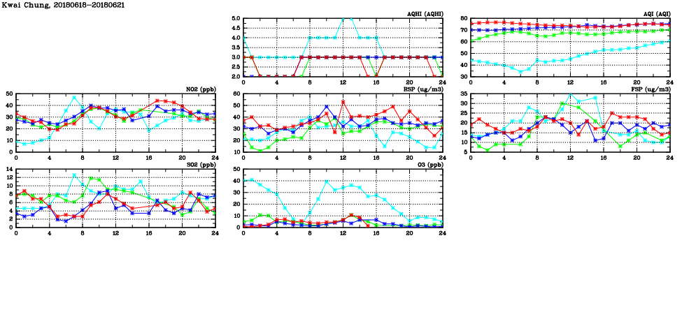 | Air Quality Data Time Series in Kwai Chung (2018/06/21) | ( Line colors: Day -3 Day -2 Day -1 Current day ) | 2D Map Current AQHI |