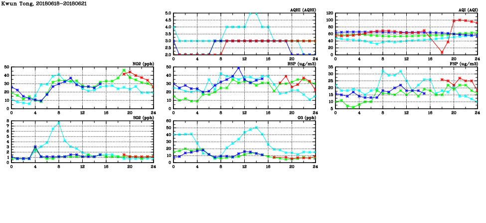 | Air Quality Data Time Series in Kwun Tong (2018/06/21) | ( Line colors: Day -3 Day -2 Day -1 Current day ) | 2D Map Current AQHI |
