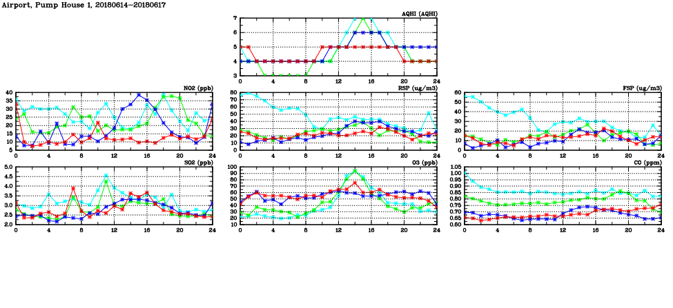| Air Quality Data Time Series in Airport, Pump House 1 (2018/06/17) | ( Line colors: Day -3 Day -2 Day -1 Current day ) | 2D Map Current AQHI |