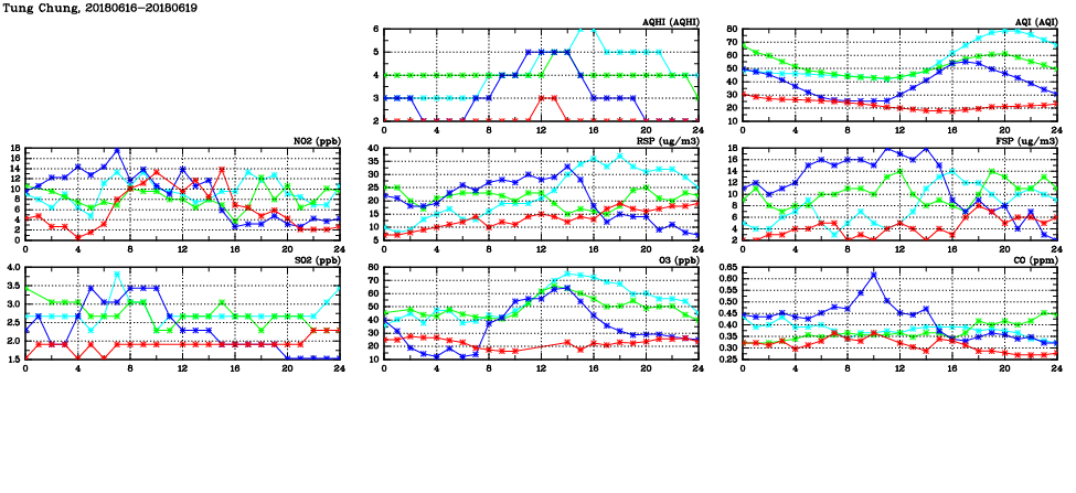 | Air Quality Data Time Series in Tung Chung (2018/06/19) | ( Line colors: Day -3 Day -2 Day -1 Current day ) | 2D Map Current AQHI |