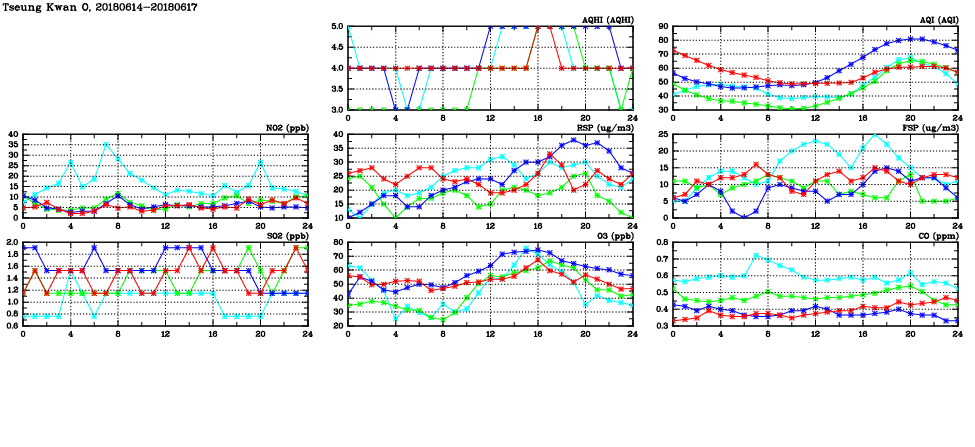 | Air Quality Data Time Series in Tseung Kwan O (2018/06/17) | ( Line colors: Day -3 Day -2 Day -1 Current day ) | 2D Map Current AQHI |