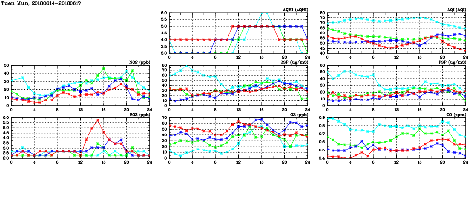 | Air Quality Data Time Series in Tuen Mun (2018/06/17) | ( Line colors: Day -3 Day -2 Day -1 Current day ) | 2D Map Current AQHI |