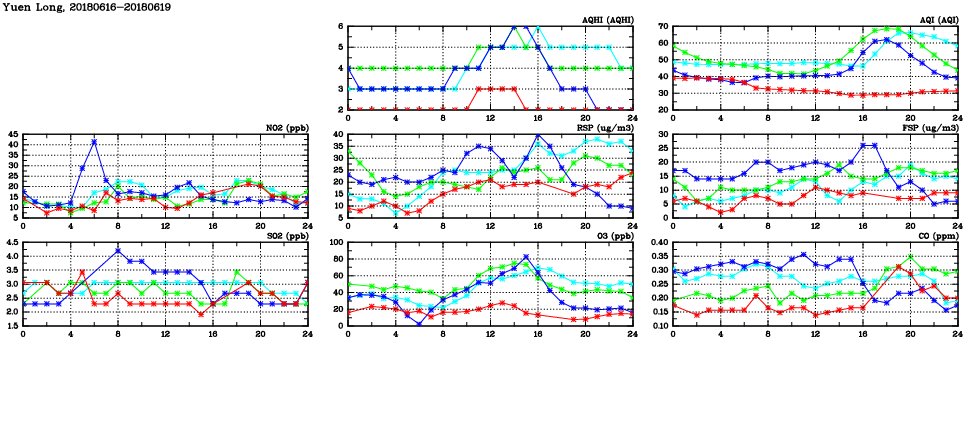 | Air Quality Data Time Series in Yuen Long (2018/06/19) | ( Line colors: Day -3 Day -2 Day -1 Current day ) | 2D Map Current AQHI |