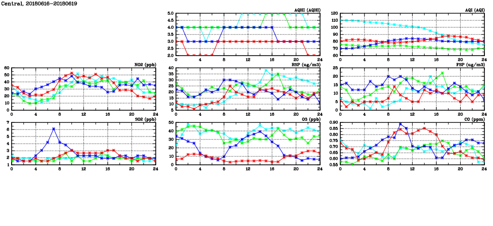 | Air Quality Data Time Series in Central (2018/06/19) | ( Line colors: Day -3 Day -2 Day -1 Current day ) | 2D Map Current AQHI |