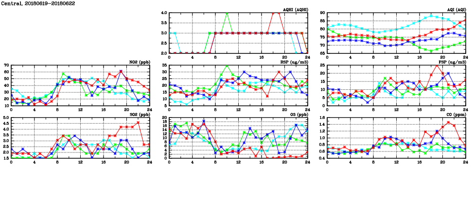 | Air Quality Data Time Series in Central (2018/06/22) | ( Line colors: Day -3 Day -2 Day -1 Current day ) | 2D Map Current AQHI |