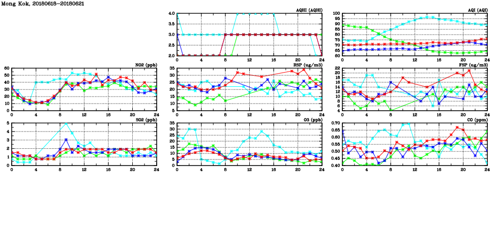 | Air Quality Data Time Series in Mong Kok (2018/06/21) | ( Line colors: Day -3 Day -2 Day -1 Current day ) | 2D Map Current AQHI |