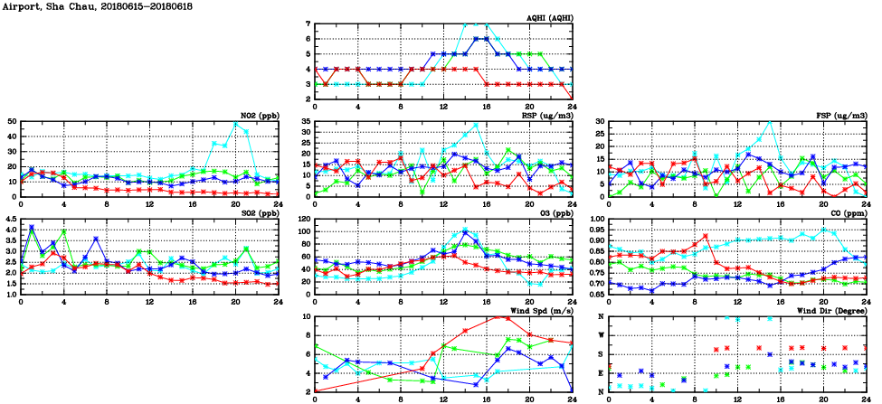 | Air Quality Data Time Series in Airport, Sha Chau (2018/06/18) | ( Line colors: Day -3 Day -2 Day -1 Current day ) | 2D Map Current AQHI |