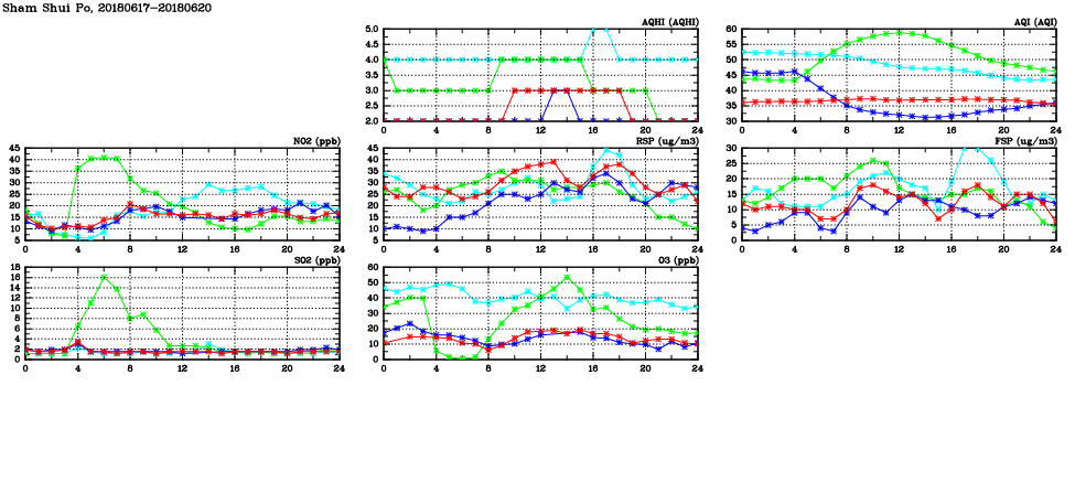 | Air Quality Data Time Series in Sham Shui Po (2018/06/20) | ( Line colors: Day -3 Day -2 Day -1 Current day ) | 2D Map Current AQHI |