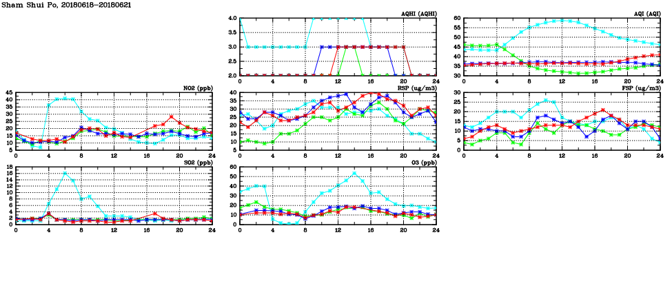 | Air Quality Data Time Series in Sham Shui Po (2018/06/21) | ( Line colors: Day -3 Day -2 Day -1 Current day ) | 2D Map Current AQHI |