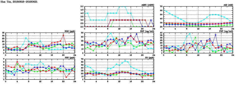 | Air Quality Data Time Series in Sha Tin (2018/06/21) | ( Line colors: Day -3 Day -2 Day -1 Current day ) | 2D Map Current AQHI |