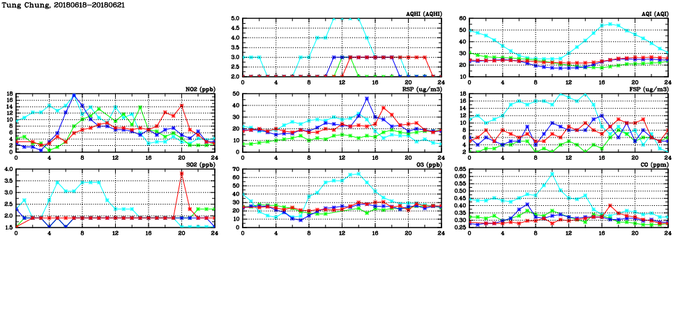 | Air Quality Data Time Series in Tung Chung (2018/06/21) | ( Line colors: Day -3 Day -2 Day -1 Current day ) | 2D Map Current AQHI |
