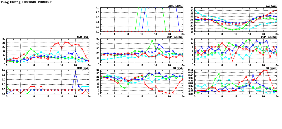 | Air Quality Data Time Series in Tung Chung (2018/06/22) | ( Line colors: Day -3 Day -2 Day -1 Current day ) | 2D Map Current AQHI |