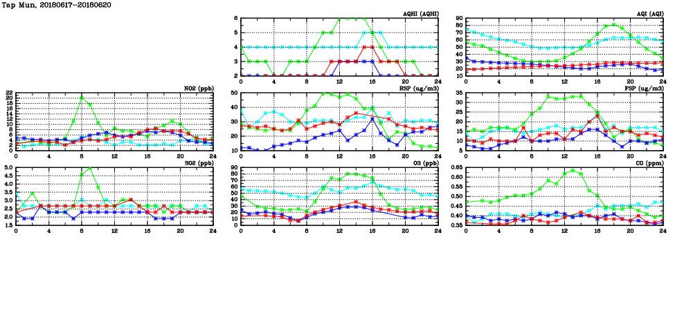 | Air Quality Data Time Series in Tap Mun (2018/06/20) | ( Line colors: Day -3 Day -2 Day -1 Current day ) | 2D Map Current AQHI |