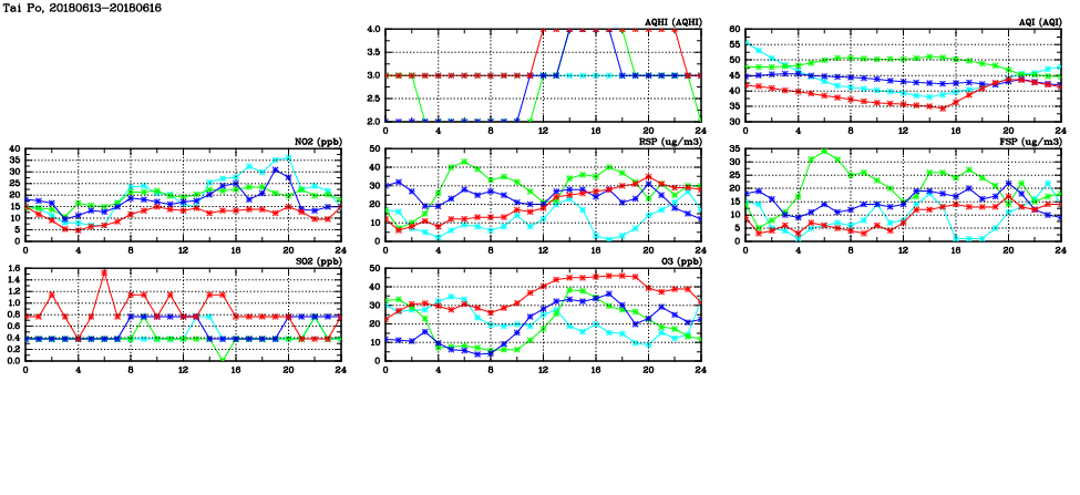 | Air Quality Data Time Series in Tai Po (2018/06/16) | ( Line colors: Day -3 Day -2 Day -1 Current day ) | 2D Map Current AQHI |