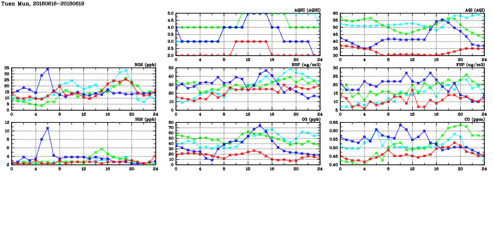 | Air Quality Data Time Series in Tuen Mun (2018/06/19) | ( Line colors: Day -3 Day -2 Day -1 Current day ) | 2D Map Current AQHI |