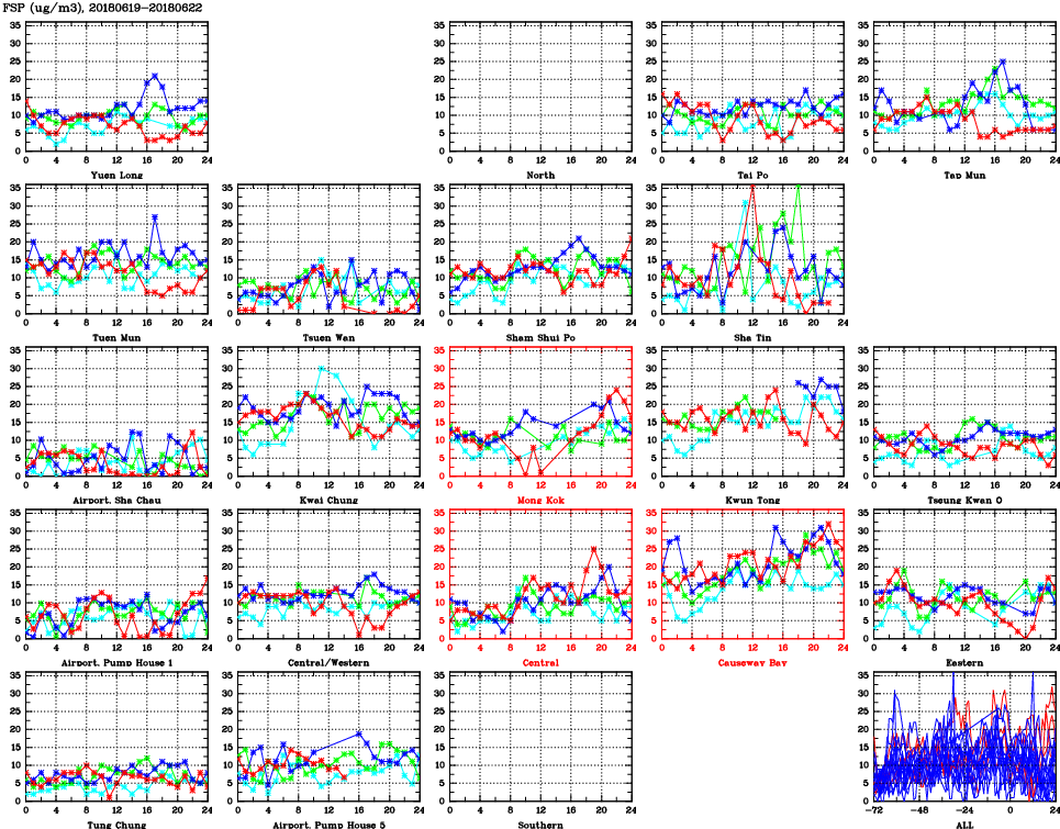 | Air Quality Data Time Series for FSP (2018/06/22) | ( Line colors: Day -3 Day -2 Day -1 Current day ) | 2D Map Current AQHI |