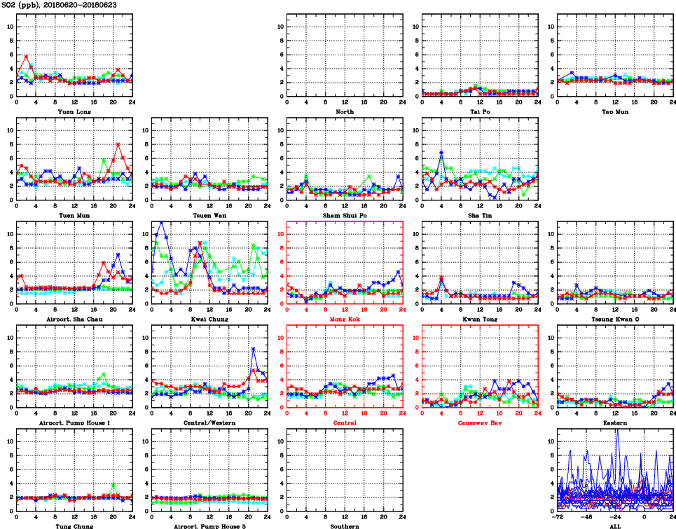 | Air Quality Data Time Series for SO2 (2018/06/23) | ( Line colors: Day -3 Day -2 Day -1 Current day ) | 2D Map Current AQHI |