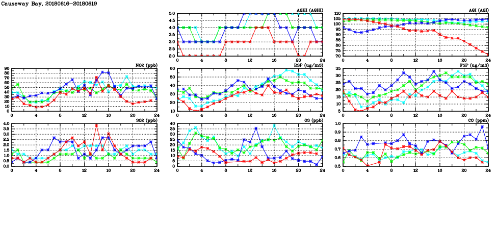 | Air Quality Data Time Series in Causeway Bay (2018/06/19) | ( Line colors: Day -3 Day -2 Day -1 Current day ) | 2D Map Current AQHI |