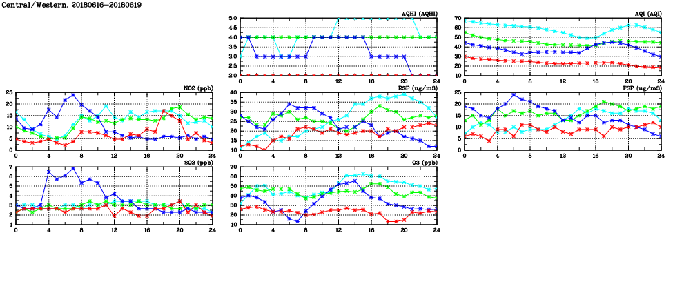 | Air Quality Data Time Series in Central/Western (2018/06/19) | ( Line colors: Day -3 Day -2 Day -1 Current day ) | 2D Map Current AQHI |
