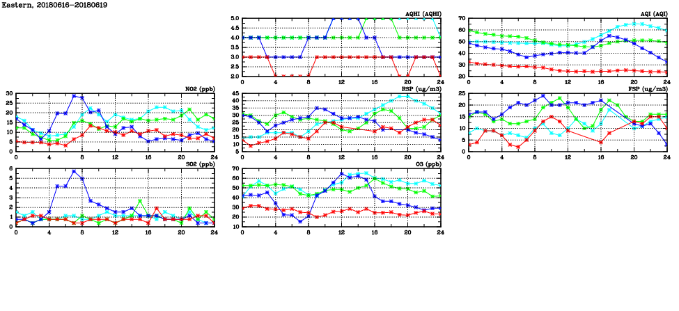 | Air Quality Data Time Series in Eastern (2018/06/19) | ( Line colors: Day -3 Day -2 Day -1 Current day ) | 2D Map Current AQHI |